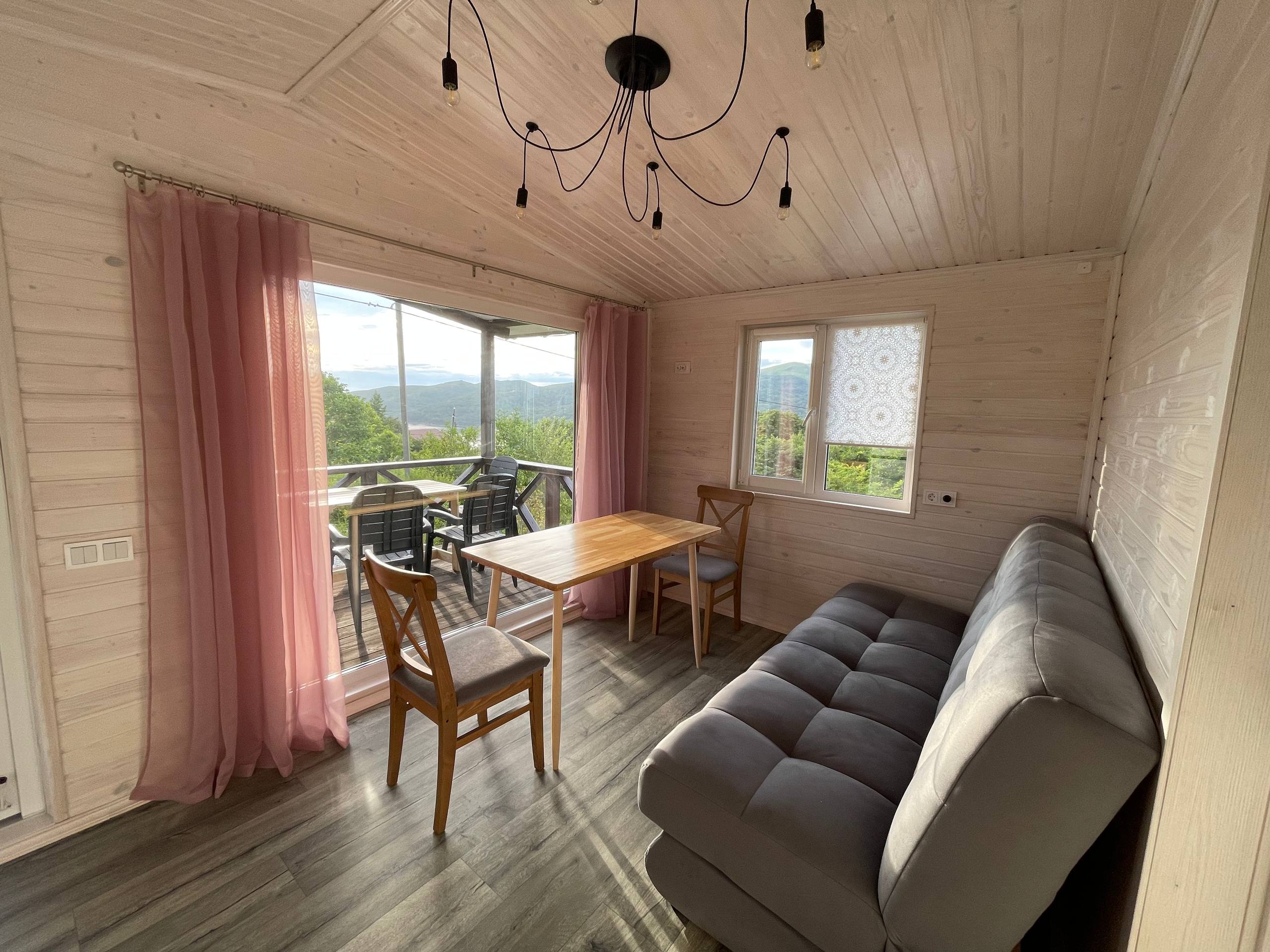 Домик Атмосфера - это Двухкомнатные домики с панорамным остеклением т видом на бухту Витязь.